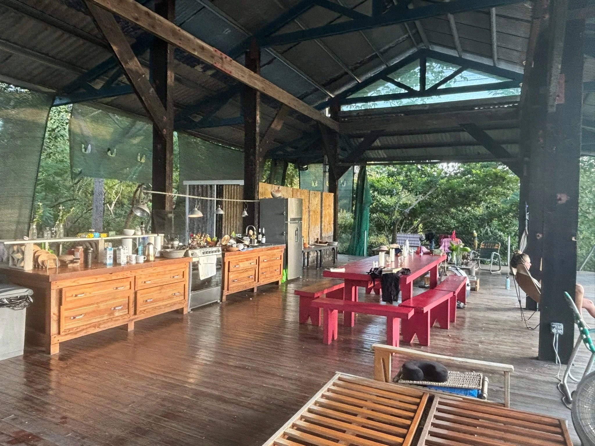 Kitchen platform One platform is dedicated to cooking, eating, and socializing. There is a large farm style table that seats 14; the table and benches were built by our great buddy Johnny Bates from upcycled oak gymnasium flooring from the Panama Canal Zone. The kitchen itself has pretty much everything one needs to prepare great meals. We start every morning with fantastic Boquete coffee, so you know we have a coffee grinder and French press! The kitchen platform includes a living area with couches and chairs for hanging out, hammocks for more hanging out, board games and books. It is a great space for playing games, bird watching, enjoying the sunrise (where else can you see it rise over the Pacific), star gazing, and just shooting the breeze.