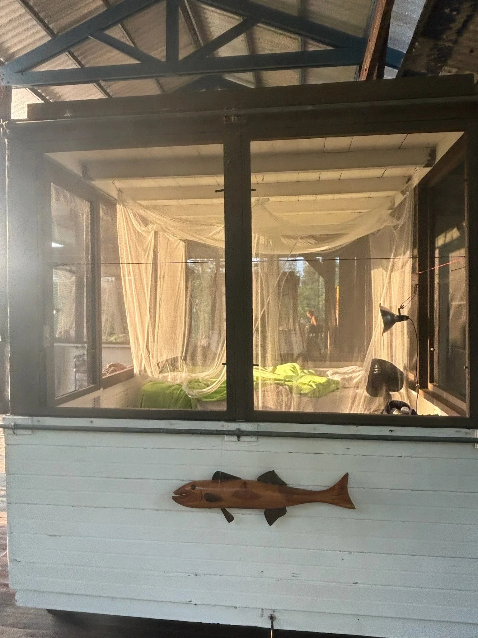 There are three sleeping cubes equipped with fans and screens. Each sleeping cube has a full size bed. There are three additional beds (a futon and two single beds). The futon is on the kitchen platforms. The two single beds are on the same platform as the three sleeping cubes. There are also hammocks available for resting or sleeping and areas with hooks to bring a camping hammock for an extra sleeping option.
